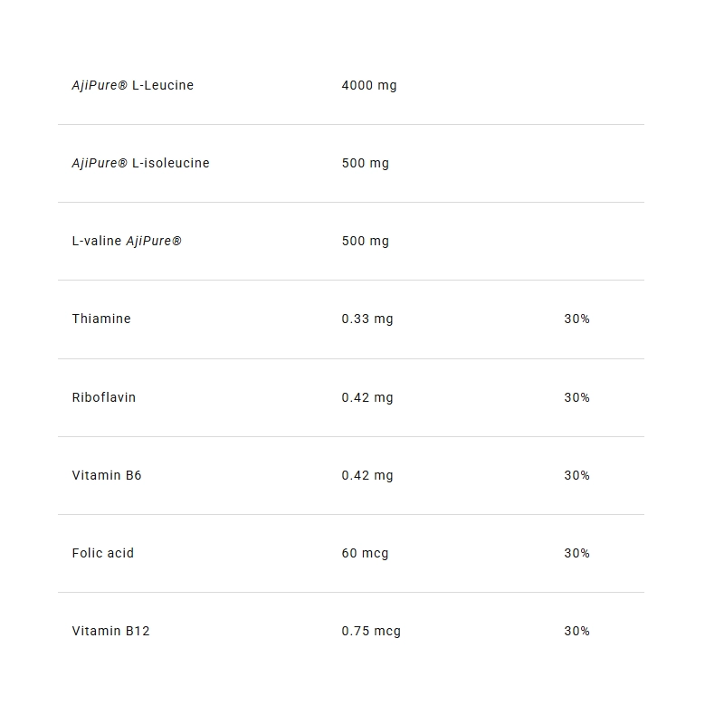 Sudedamosios dalys: instantizuotas šakotos grandinės aminorūgščių mišinys [L-leucinas (AjiPure®), L-izoleucinas (AjiPure®), L-valinas (AjiPure®), emulsiklis: riebalų rūgščių sacharozės esteriai], rūgštingumą reguliuojanti medžiaga: citrinų rūgštis; kvapiosios medžiagos, saldikliai: sukralozė, acesulfamas K; piridoksino hidrochloridas (vitaminas B6), riboflavinas (vitaminas B2), tiamino hidrochloridas (vitaminas B1), pteroilmonoglutamino rūgštis (folio rūgštis), cianokobalaminas (vitaminas B12).