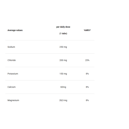 - Papildo sudėtyje yra penki pagrindiniai elektrolitai: natris, kalis, kalcis, magnis ir chloras. Šie mineralai yra būtini normaliai raumenų ir nervų sistemos veiklai, padeda reguliuoti skysčių balansą bei palaikyti rūgščių–šarmų pusiausvyrą organizme.