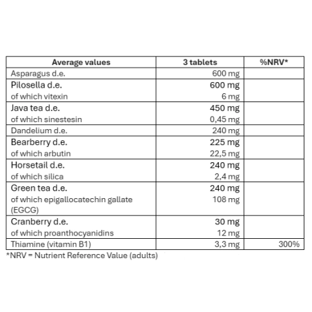 Sudedamosios dalys: užpildas: celiuliozė; šparagų (Asparagus officinalis L.) šaknis d.e., piliarožės (Hieracium pilosellae L.) antžeminė dalis d.e. tit. 1 % viteksino, Javos arbata (Orthosiphon aristatus (Blume) Miq.) žydinčios antžeminės dalys d.e. tit. 0,1 % sinensetino, kiaulpienės (Taraxacum campylodes G.E. Haglund) šaknies d.e., žaliosios arbatos (Camellia sinensis (L.) Kuntze) lapų d.e. tit. 45 % epigalokatechino galato (EGCG), Dirvinis asiūklis (Equisetum arvense L.) antžeminė dalis d.e. tit 1 % silicio dioksido, meškauogės (Arctostaphylos uva ursi (L.) Spreng) lapų d.e. tit 10 % arbutinas, apvalkalas (glajinės medžiagos: hidroksipropilmetilceliuliozė, glicerolis, talkas; dažikliai: kalcio karbonatas, chlorofilinų vario kompleksai), stabilizatorius : riebalų rūgščių mono- ir digliceridai; lipnumą reguliuojančios medžiagos: riebalų rūgščių magnio druskos, silicio dioksidas; spanguolių (Vaccinium macrocarpon Aiton.) vaisiai d.e. tit. 40 % proantocianidinų, tiamino hidrochloridas (vitaminas B1).