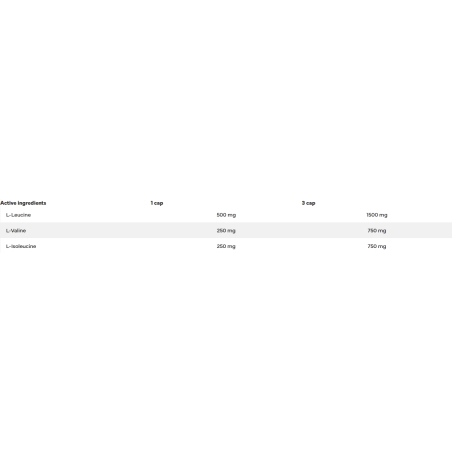 Sudedamosios dalys: L-leucinas, L-izoleucinas, L-valinas, celiuliozės kapsulė (HPMC).