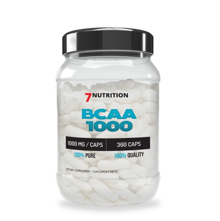 7 Nutrition BCAA 2:1:1 1000 – maisto papildas su BCAA (leucinu, izoleucinu ir valinu) santykiu 2:1:1, skirtas raumenų atsistatymui, nuovargio mažinimui ir treniruočių efektyvumui palaikyti.