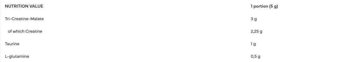 Sudedamosios dalys: kreatino malatas; taurinas; L-glutaminas; rūgštingumą reguliuojanti medžiaga: obuolių rūgštis; lipnumą reguliuojanti medžiaga: silicio dioksidas; stabilizatorius E414; kvapiosios medžiagos; saldiklis: sukralozė.