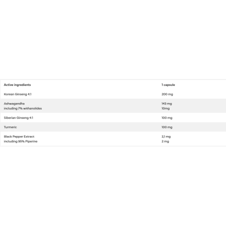 Sudedamosios dalys: Korėjos ženšenio ekstraktas (korėjietiškasis panax) 4:1, ašvagandos šaknų ekstraktas (7 % vitanolidų), Sibiro ženšenio ekstraktas (eleutherococcus senticosus) 4:1, ciberžolė, juodųjų pipirų ekstraktas (95 % piperino), celiuliozės kapsulė (HPMC).
