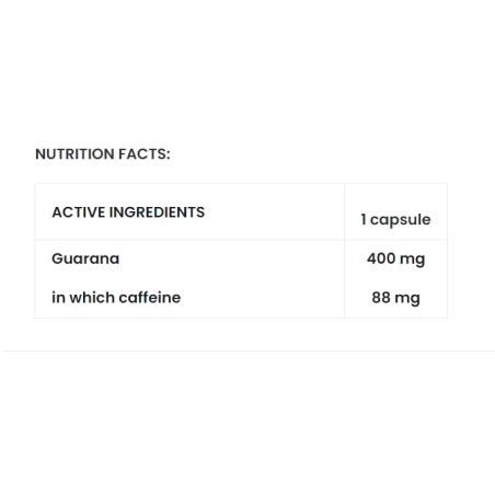 Sudedamosios dalys: Guaranos sėklų ekstraktas (Paulinia cupana), standartizuotas 22 % kofeino, celiuliozės kapsulė (HPMC).