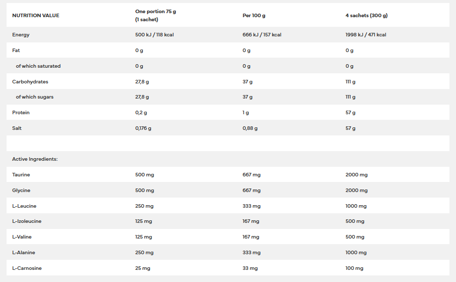 Rekomenduojama vartoti: 1–2 geliai per valandą intensyvaus fizinio krūvio metu. Neviršykite 4 gelių per dieną.