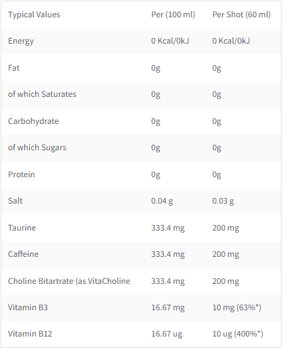 Sudedamosios dalys: vanduo, rūgštingumą reguliuojančios medžiagos (citrinų rūgštis, obuolių rūgštis, fosforo rūgštis), bevandenis kofeinas, cholino bitartratas (VitaCholine™), taurinas, konservantai (kalio sorbatas, natrio benzoatas). Saldiklis (sukralozė), kvapiosios medžiagos, vitaminas B3 (niacinas), vitaminas B12.