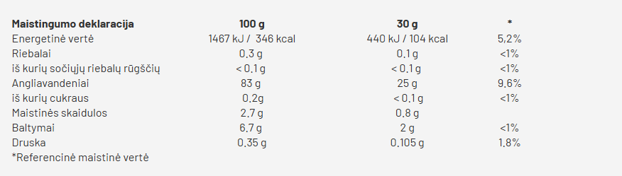 Rekomenduojama vartoti: Sumaišykite 30 g Cream of Rice su 150–200 ml karšto vandens arba pieno, kad gautumėte skanią ir lengvai virškinamą košę. Galite naudoti ir kaip ingredientą įvairiems patiekalams, tokiems kaip kokteiliai ar desertai.