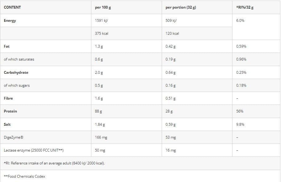 Sudedamosios dalys: išrūgų baltymų izoliatas (PIENAS, emulsiklis: saulėgrąžų lecitinas), maltodekstrinas, neriebūs kakavos milteliai, druska, tirštiklis (ksantano derva), kvapiosios medžiagos, emulsiklis (SOJŲ lecitinas), rūgštingumą reguliuojanti medžiaga (citrinų rūgštis), virškinimo fermentas (Digezyme®), saldiklis (sukralozė), Beta-galaktozidazė.