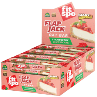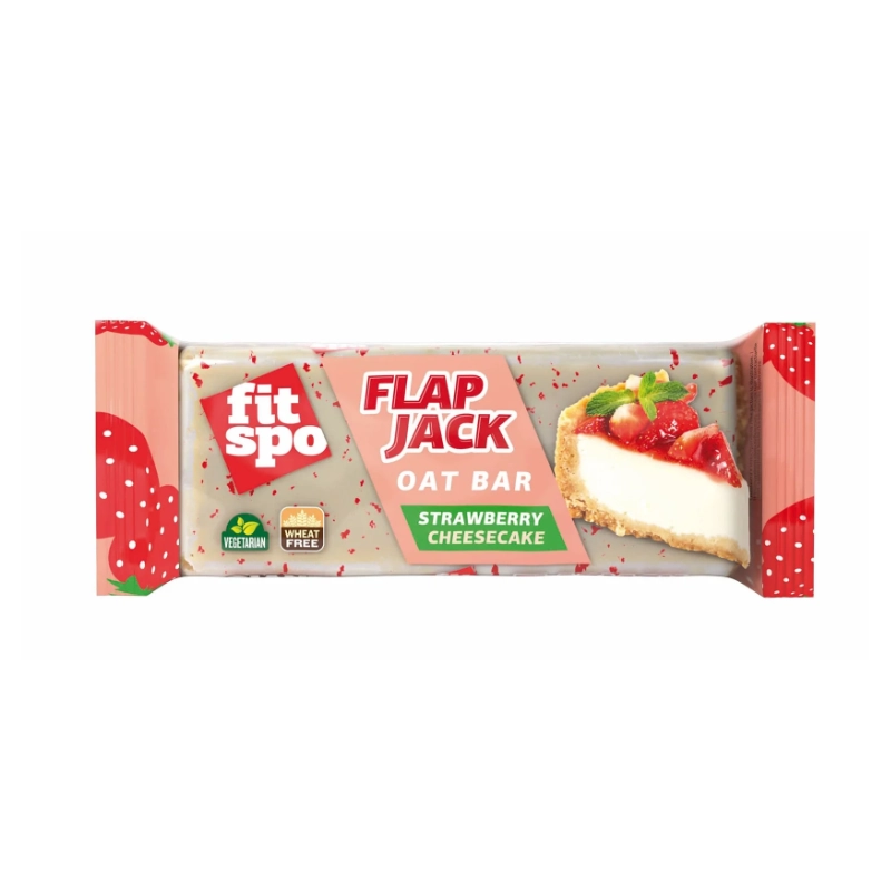 • FitSpo Flap Jack Strawberry Cheesecake – gardus energijos batonėlis iš avižinių dribsnių su braškių ir sūrio deserto glazūra.