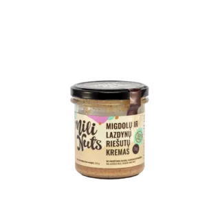 Mili Nuts migdolų ir lazdynų riešutų kremas – skanus ir maistingas kremas, pagamintas iš aukščiausios kokybės migdolų ir lazdynų riešutų. Subalansuotas riešutų derinys suteikia švelnų, subtilų skonį ir kreminę tekstūrą, todėl kremas puikiai tinka tepti ant duonos, blynų ar skrebučių, gardinti desertus arba mėgautis kaip užkandžiu bet kuriuo paros metu.