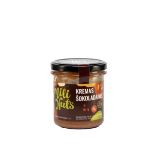 Mili Nuts Riešutų kremas „Šokoladainis” – skanus ir išskirtinis kremas, derinantis aukščiausios kokybės riešutų ir sodraus šokolado skonį. Švelni, kremiška tekstūra ir intensyvus šokoladinis aromatas paverčia šį kremą puikiu pasirinkimu tepti ant duonos, blynų ar skrebučių, gardinti desertus arba mėgautis kaip užkandžiu bet kuriuo paros metu.