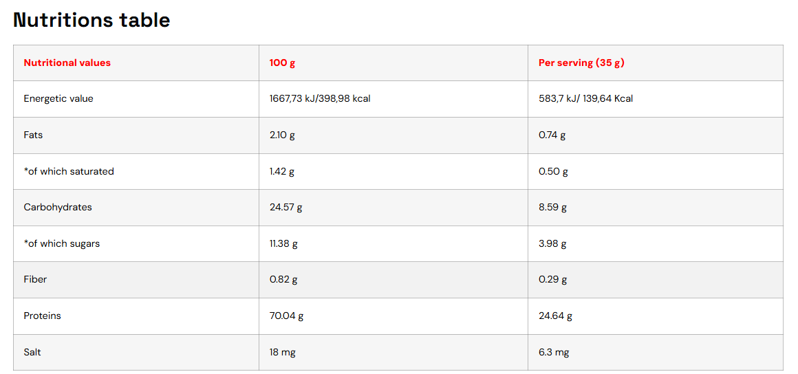 • Dėl puikaus virškinamumo ir aukšto baltymų kiekio produktas užtikrina efektyvų maistinių medžiagų pasisavinimą. Aminorūgščių gausa palaiko raumenų tonusą, energiją ir fizinį pajėgumą, todėl tai idealus pasirinkimas tiek po treniruotės, tiek dienos metu.